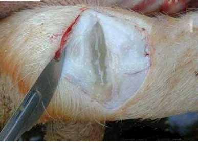 病理變化主要是多發(fā)性漿膜炎和關(guān)節(jié)炎。即纖維素性心包炎、胸膜炎和腹膜炎。表現(xiàn)為喉頭充血,胸腔和心包腔積液。后期則發(fā)生心包和心外膜、胸膜和肺臟、腹膜與腹腔器官的粘連。若強(qiáng)行撕開(kāi)心包膜,心外膜可留下絨毛狀的外觀,稱(chēng)為“絨毛心”。切開(kāi)腫脹的關(guān)節(jié),可見(jiàn)有乳黃色的膠凍樣液體。