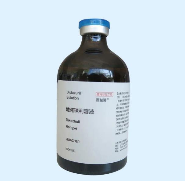 藥理作用:地克珠利為三嗪類廣譜抗球蟲藥,主要抑制子孢子和繁殖體增殖,對球蟲的活性峰期在子孢子和第一代繁殖體(即球蟲生命周期的最初2天)。具有殺球蟲作用,對球蟲發(fā)育的各個階段有效。對雞的柔嫩、堆型、毒害、布氏、巨型等艾美爾球蟲有效,對鴨和兔的球蟲均有良好的效果。地克珠利組織中殘留少,對畜禽都很安全。本品長期用藥易誘導耐藥性的產(chǎn)生,故應穿梭或輪換用藥。本品作用時間短,停藥2日后作用基本消失。